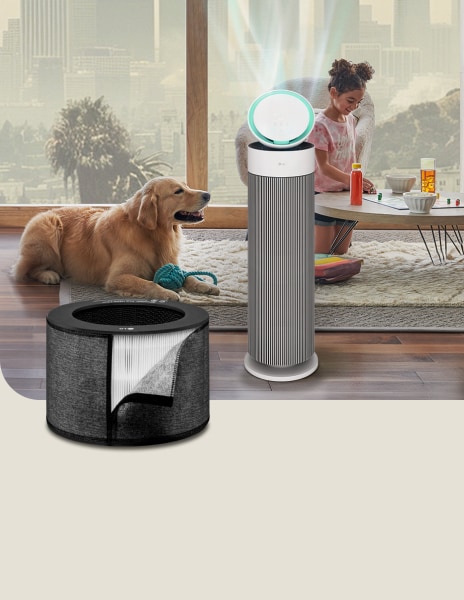*Tested by LG's in-house laboratory in a pet cafe in a 132 m2 enclosed area using PuriCare Air Purifier Pet (AS309DNP) in Pet Mode and PuriCare 360° (AS309DWA) in Auto Mode, measuring the weight of dust and hair collected in the lower filter. Results may vary depending on environmental conditions and other external factors.